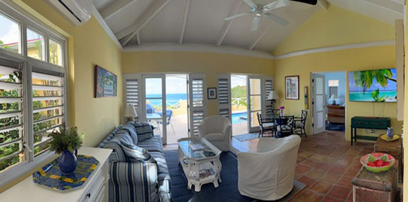 The great room is decorated with West Indian style furnishings in soft caribbean colors with comfortable furniture and splashes of color and whimsy. As you enter, the french doors open to bring in the outside living environment.