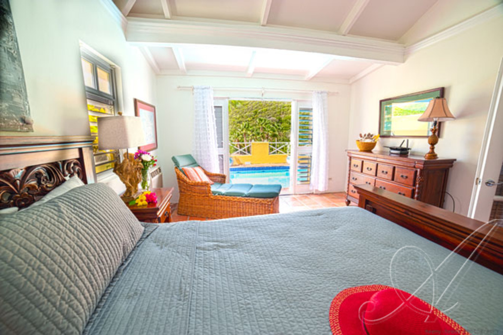 The master bedroom suite off the great room is large with its own set of French door leading to the pool area and features a King size bed, TV, air conditioning and ceiling fan and bath en suite with large walk in marble shower.