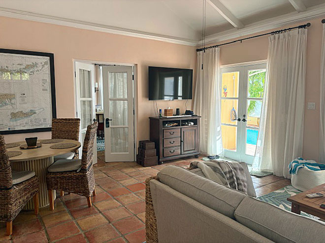The living room area is awash in elegance and tropical